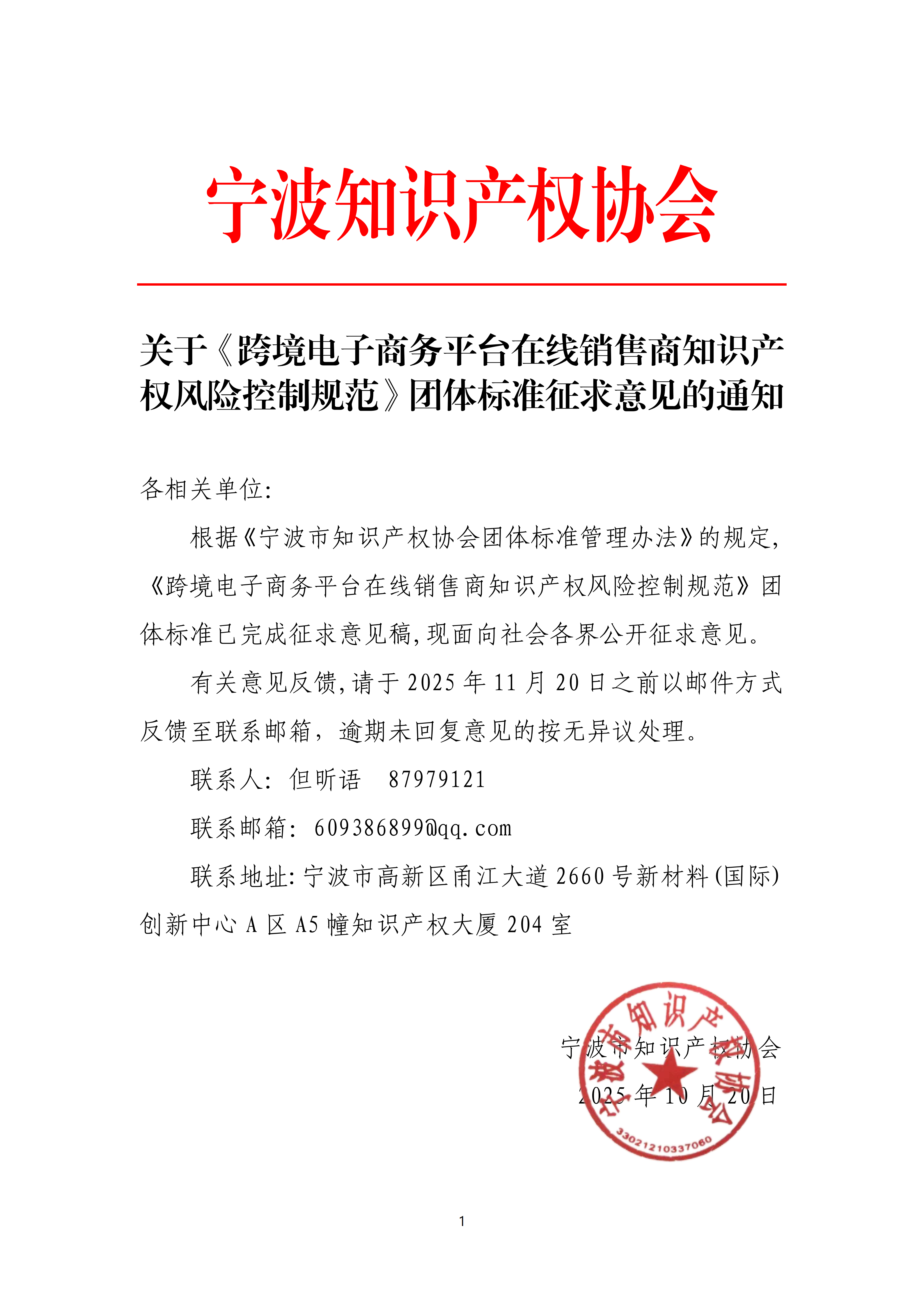 根據《寧波市知識產權協會團體標準管理辦法》的規定,《跨境電子商務平臺在線銷售商知識產權風險控制規范》團體標準已起草了征求意見稿,現向社會公開征求意見,請認真研究并提出修改意見。有關意見反饋,請于2025年11月20日之前以郵件方式反饋至聯系郵箱,逾期未回復意見的按無異議處理。