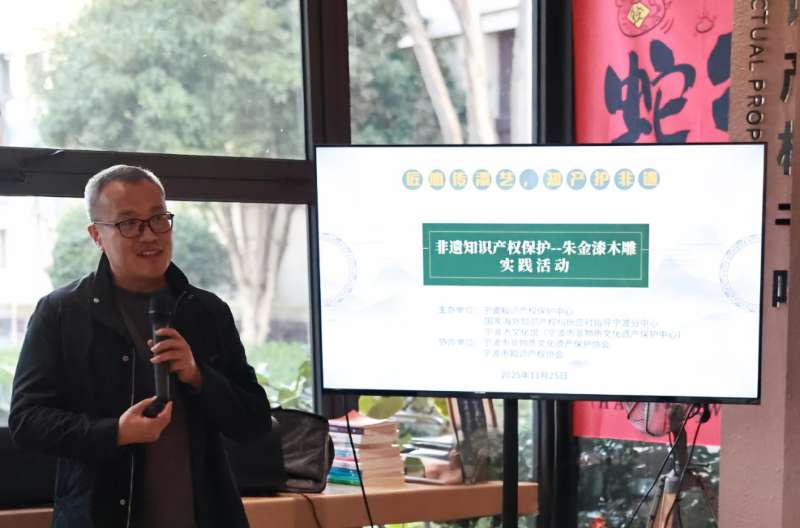 為深入貫徹知識產權強國戰略,推動傳統技藝與現代法治深度融合,全面提升非物質文化遺產的知識產權保護專業化水平,11月25日下午,由寧波知識產權保護中心、國家海外知識產權糾紛應對指導寧波分中心聯合寧波市文化館(寧波市非物質文化遺產保護中心)主辦,寧波市知識產權協會協同寧波市非物質文化保護遺產協會共同承辦的“匠心傳漆藝 知產護非遺——朱金漆木雕非遺保護”實踐活動圓滿落幕。寧波知識產權保護中心主任陳超、副主任董莎出席活動,中國計量大學知識產權學院副院長冀瑜教授、朱金漆木雕藝術館陳位位老師受邀講課,二十余位非遺傳承愛好者、企業知識產權負責人及行業從業者參與此次活動。