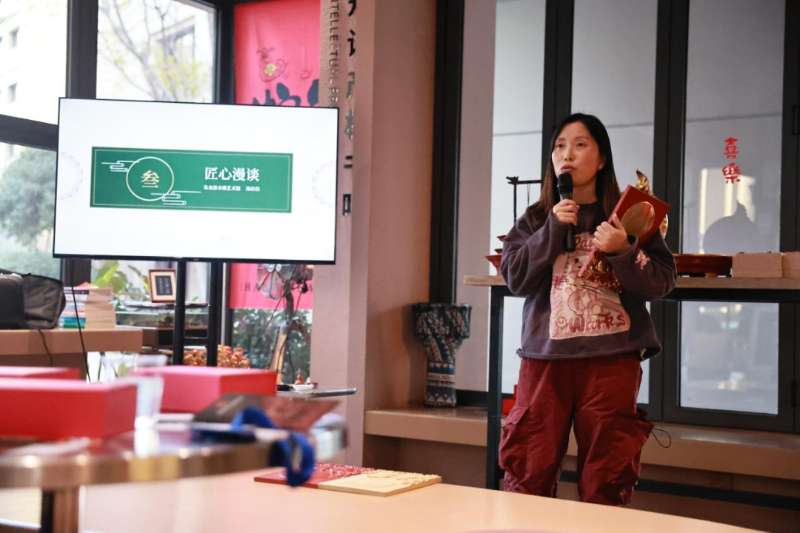 隨后,陳位位老師以“匠心”為核心展開現場教學,帶領參與者走進朱金漆木雕的文化世界。陳老師從理論層面系統梳理了朱金漆木雕的歷史淵源與傳承脈絡,深入解析了從選材、雕琢、打磨到上漆、裝飾的核心工藝流程,著重闡釋了其刀法渾厚、髹漆絢爛的獨特技藝特征,向參與者充分展現這一傳統工藝深厚的文化內涵與獨特的藝術價值。二十余位參與者在陳老師的悉心指導下,親手體驗了朱金漆木雕的制作過程,大家對非遺技藝的保護與創新、知識產權的運用與維權等話題展開深入探討,進一步深化了對非遺知識產權保護的認知。?